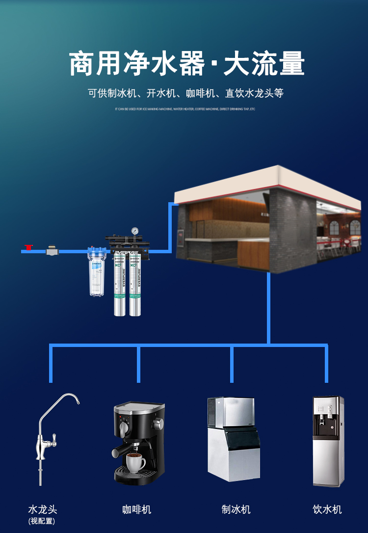 完整的系统配置可用于包括咖啡、汽水机、直饮及蒸煮设备等多种用途。