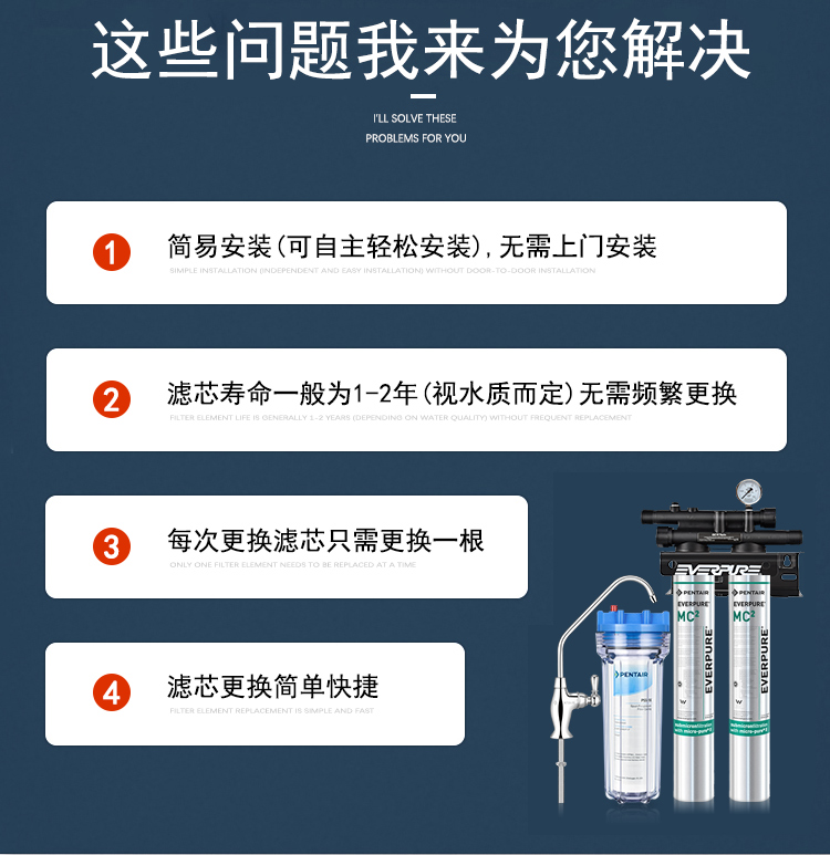 ▶滤 芯:快速更换;在同一个滤芯中降低余氯、T&O\1/2微米颗粒,抑制细菌,去除石棉、孢子;配有Micro-PureII滤料及抑菌保护